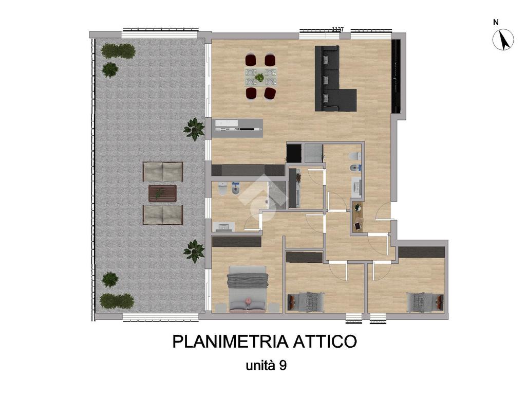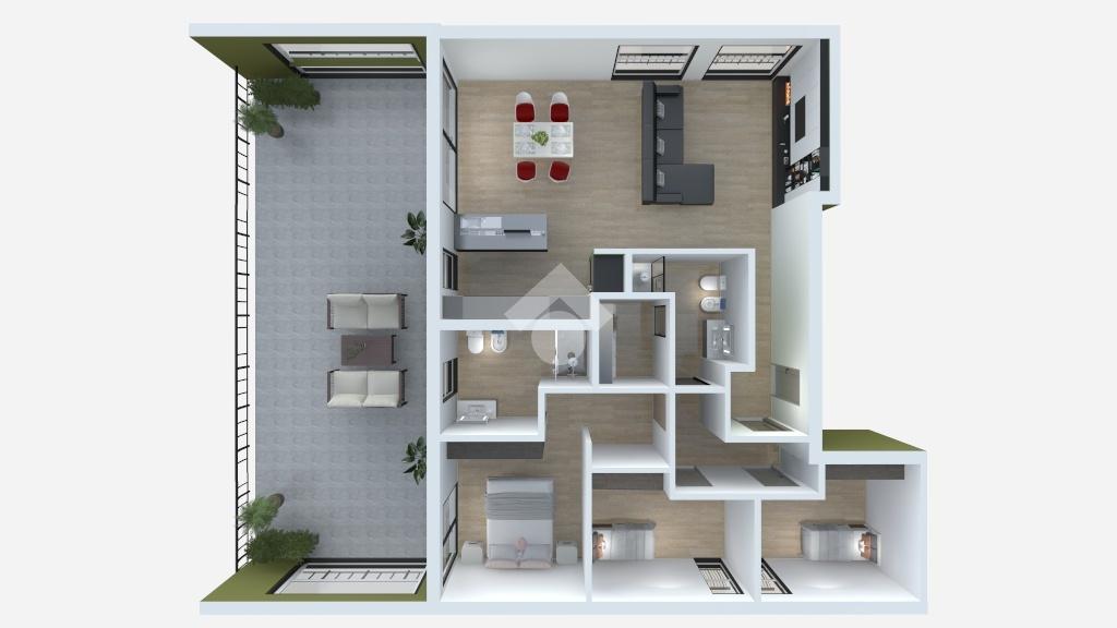 Un disimpegno ci conduce nella zona notte. Essa è composta da una camera matrimoniale con bagno finestrato privato, da altre due camere singole con accesso al terrazzo, da un secondo servizio cieco e una zona lavanderia.