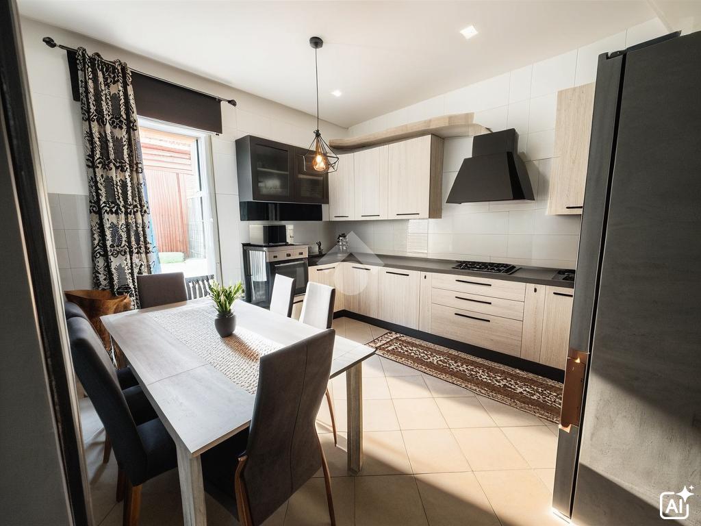 L’ingresso si apre su una luminosa zona giorno con cucina e sala da pranzo, ambiente accogliente e funzionale per la vita quotidiana.